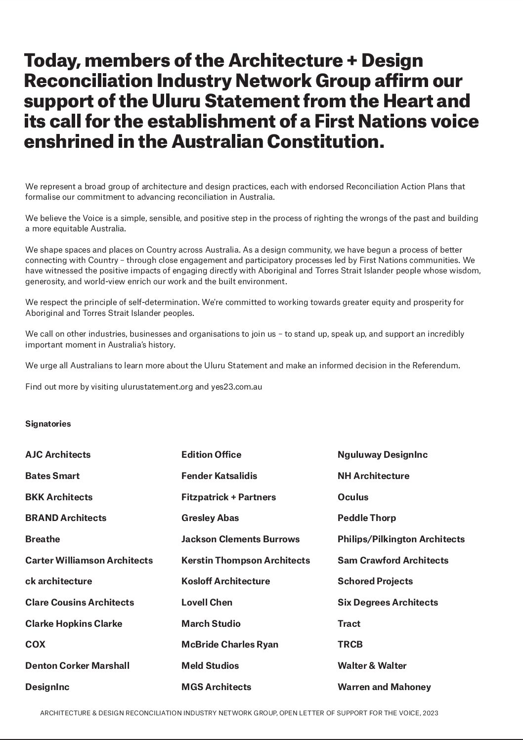 We represent a broad group of architecture and design practices, each with endorsed Reconciliation Action Plans that formalise our commitment to advancing reconciliation in Australia. We believe the Voice is a simple, sensible, and positive step in the process of righting the wrongs of the past and building a more equitable Australia.