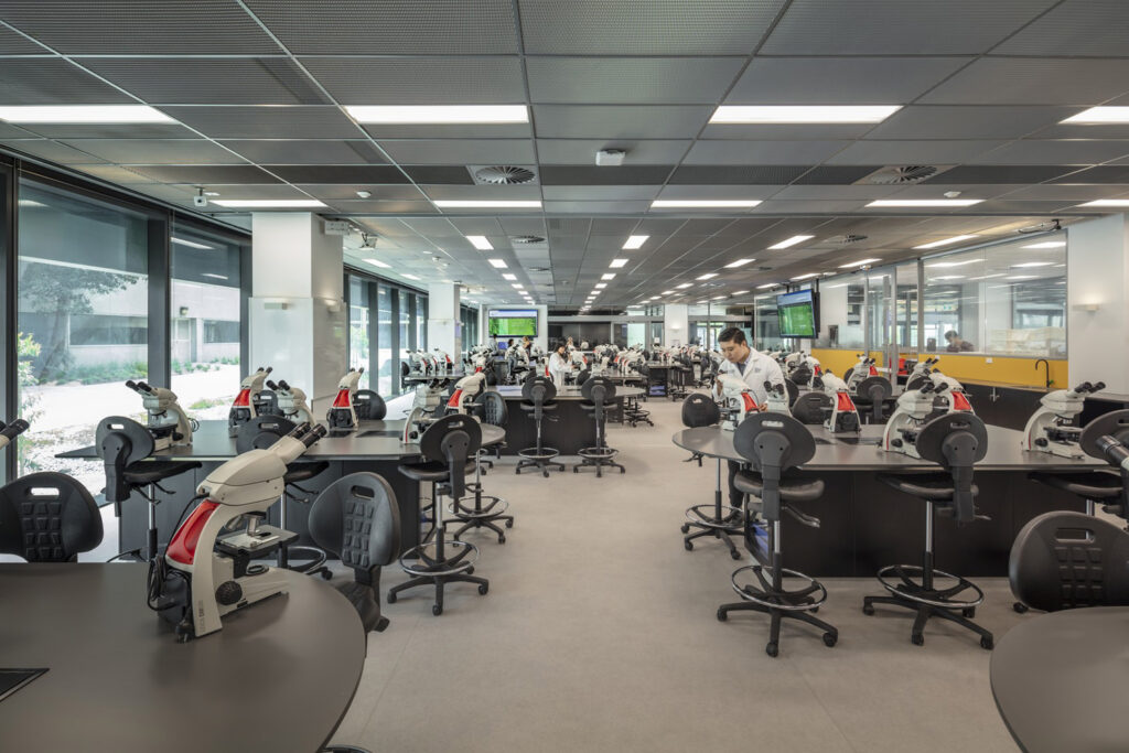 The new building incorporates an innovative pedagogical solution in four Flexi Labs. The ‘L’ shaped labs wrap around a central glazed satellite prep area providing smaller scaled, more personable lab space for cohorts of 60, 120 or interlinked space for up to 240 students, visually connected as one. This enables teaching and learning of multiple subjects concurrently and independently in a uniquely Monash solution.