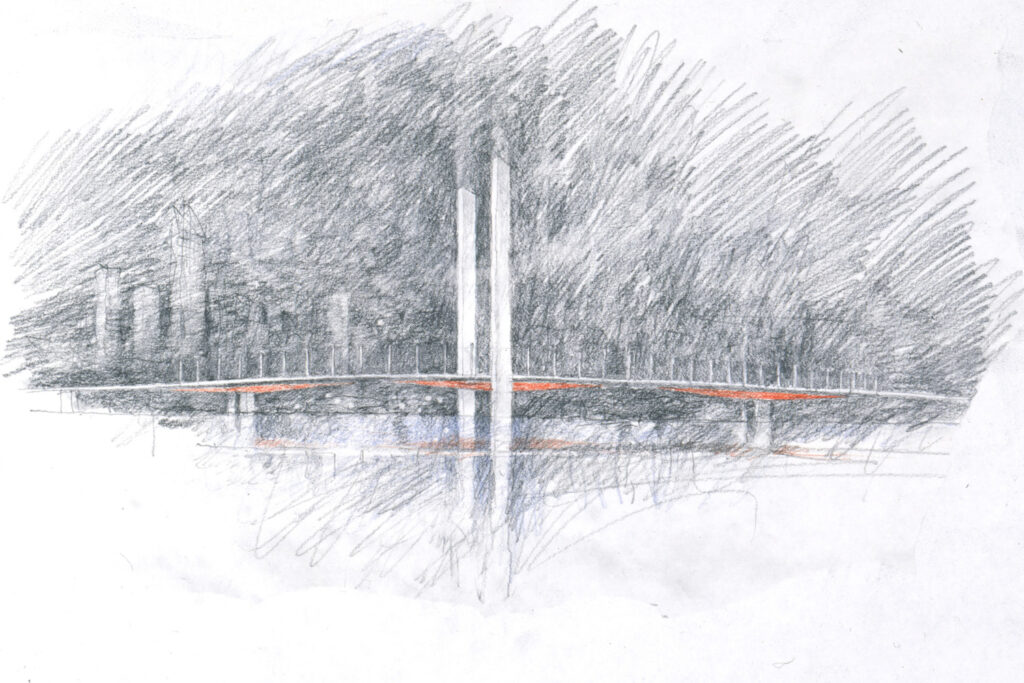 The visual composition consists of two simple gestures: a blade leaping across the river, and two slender silver sticks, 120 metre high, marking the centre point and proclaiming the presence of the bridge across the city.