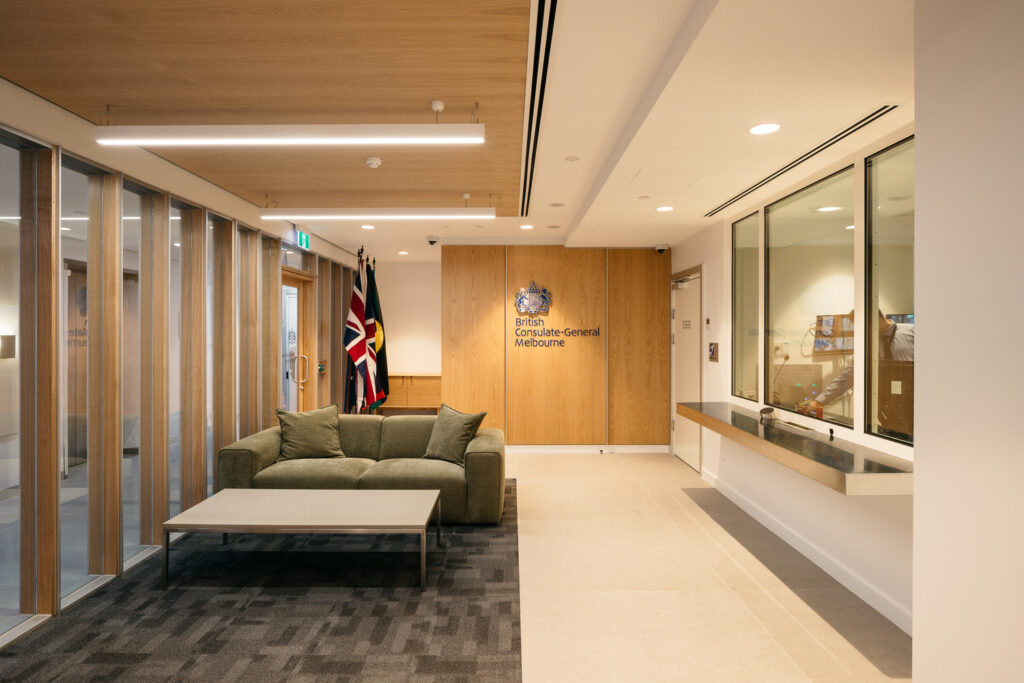The new offices and representative reception spaces for the British Consulate in Melbourne occupy 400m2 overlooking Treasury Gardens. Denton Corker Marshall’s London and Melbourne studios undertook the design in close collaboration with the future occupants.