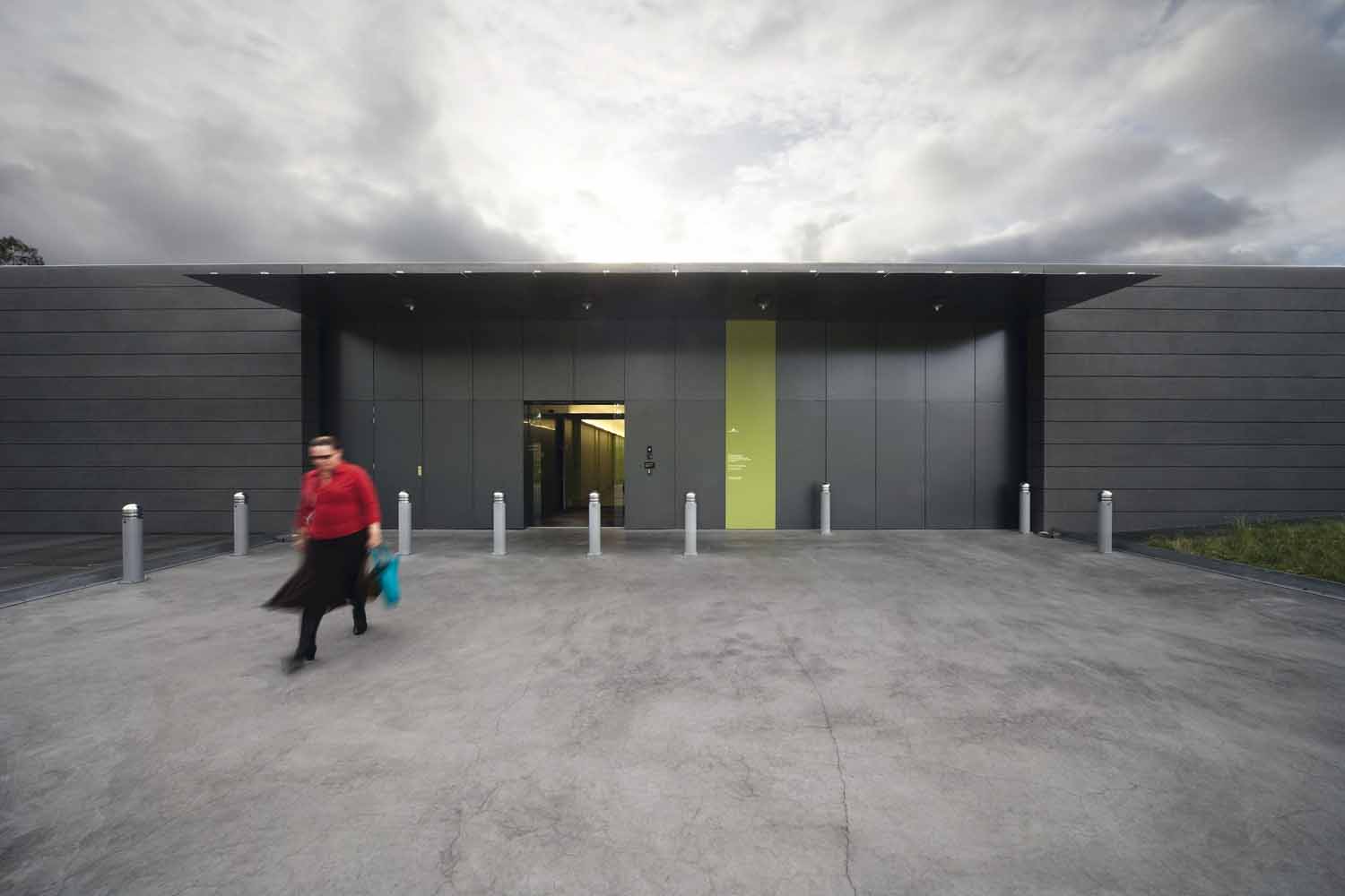 The elevation treatment facing the Memorial is a re-interpretation of the Administration Building façade, also designed by Denton Corker Marshall. Narrow horizontal slot windows are the same width and rhythm as the Administration Building but establish a greater sense of solidity to the form. The elevations comprise honed precast concrete linear ‘planks’ finely jointed with horizontal coursing.