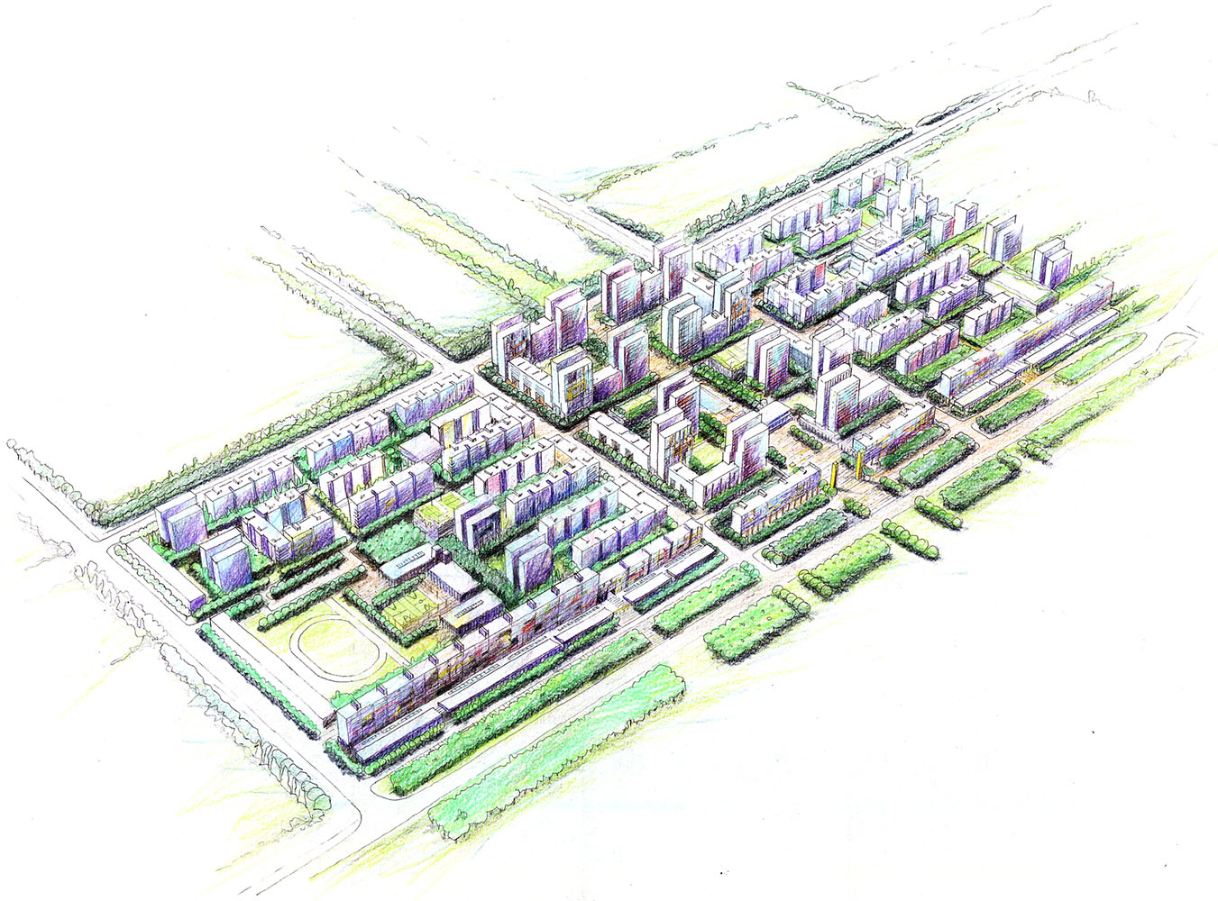– six long slab / atrium buildings placed along the main road, each containing 432 apartments over six levels;