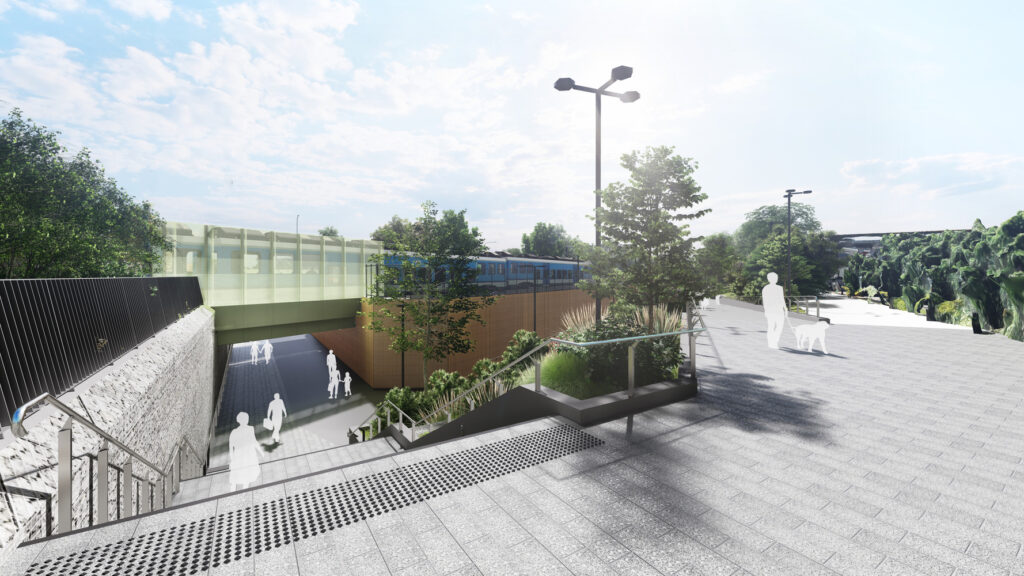 The grade separation and realignment of the road as a new road bridge to the east and a new urban renewal site at the existing crossing with grade separate pedestrian access under the rail.