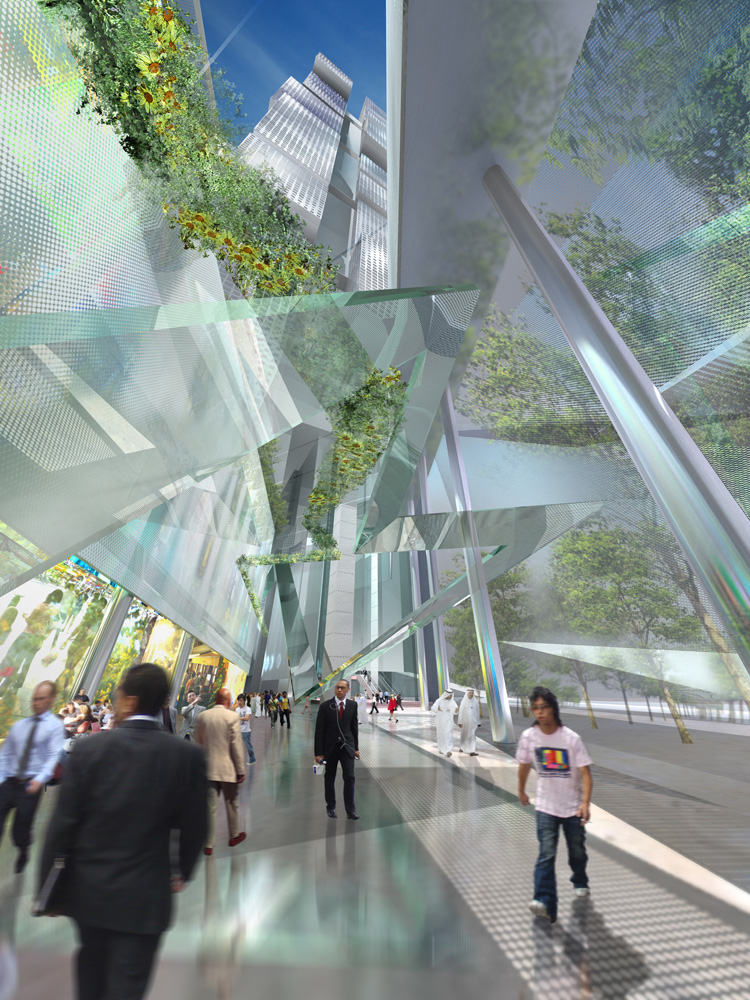 A series of powerful architectural elements is set in a landscape formation – a unique response not only to the design of a podium, but also to the prevailing climate of Dubai.