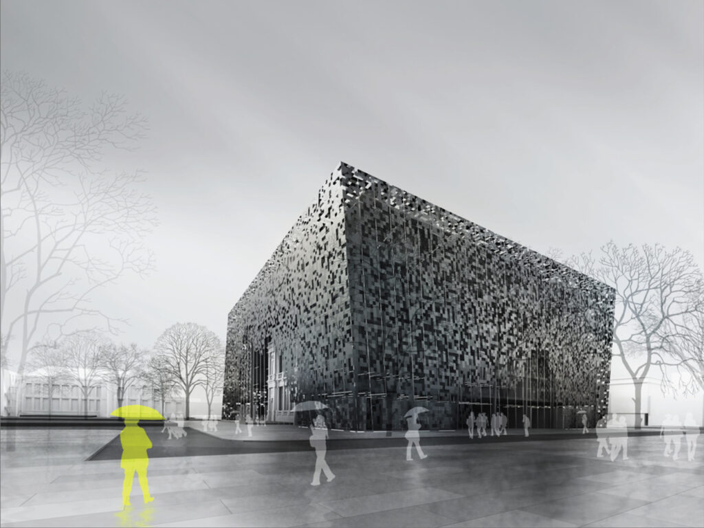 With regard to form and expression, as a place of teaching architecture, the building must express an essential defining characteristic that is about idea and content rather than style. We proposed clothing the building with an environmental skin or veil. Its effect is to give visual expression to the simplest of architectural forms – the box – with an imagery that is simultaneously neutral, powerful and expressive. The skin embodies the essence of architecture: form, articulation, volume, containment, solidity, transparency, structure and surface.
