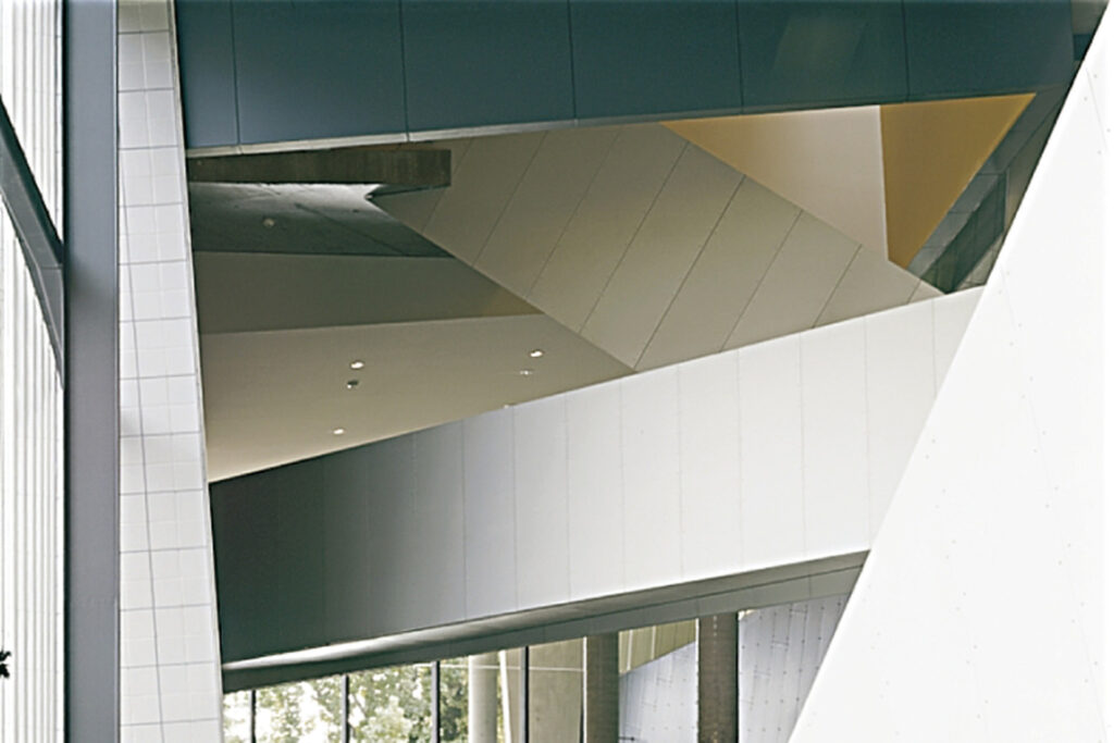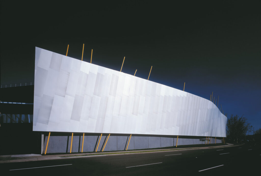 Sited on one of Melbourne’s busiest suburban roads, the building turns inwards to an internal courtyard. Its outer wall undulates along the road and is clad with a metal skin, held up by a series of yellow sticks. Viewed at speed along the highway, the image of the campus is defined by the dynamic silver wavy wall. Its anodised aluminium shingles produce a dramatic sculptural impact.