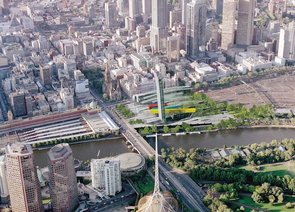 The centrepiece of the design was a 100 metre transparent steel and glass tilting tower. A symbolic gesture containing only a viewing platform, it paid respect to the cathedral spire adjacent and the nearby tower of the Arts Centre. It would become an urban icon / marker for Melbourne focussed on a narrative about the Federation of Australia.