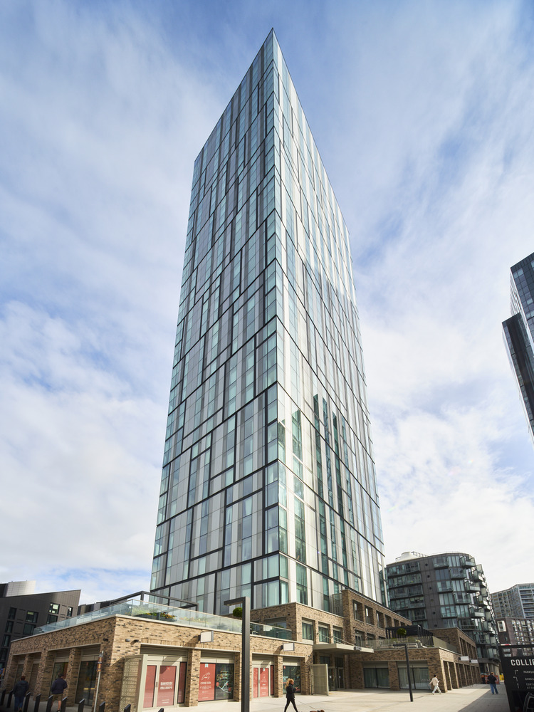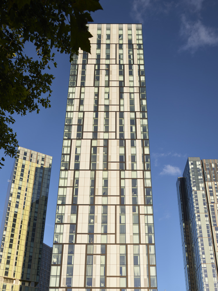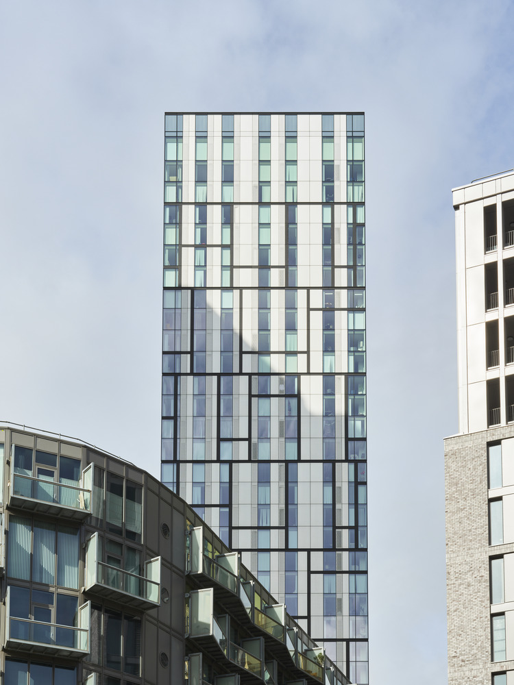Residential accommodation within the Tower is arranged in a vertical sequence of four floor levels and is expressed as a series of distinctive horizontal layers with an irregular black grid breaking up the form of the tower.