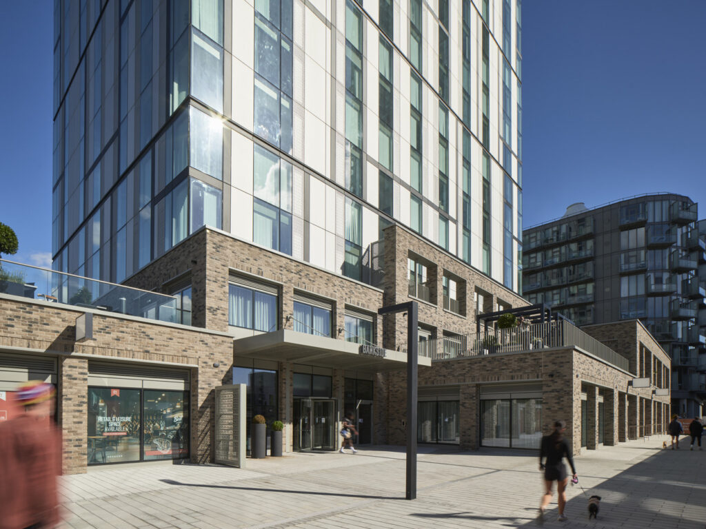 The main resident’s entrance, directly off Collier Square, contributes to the daily activity in the public realm.
