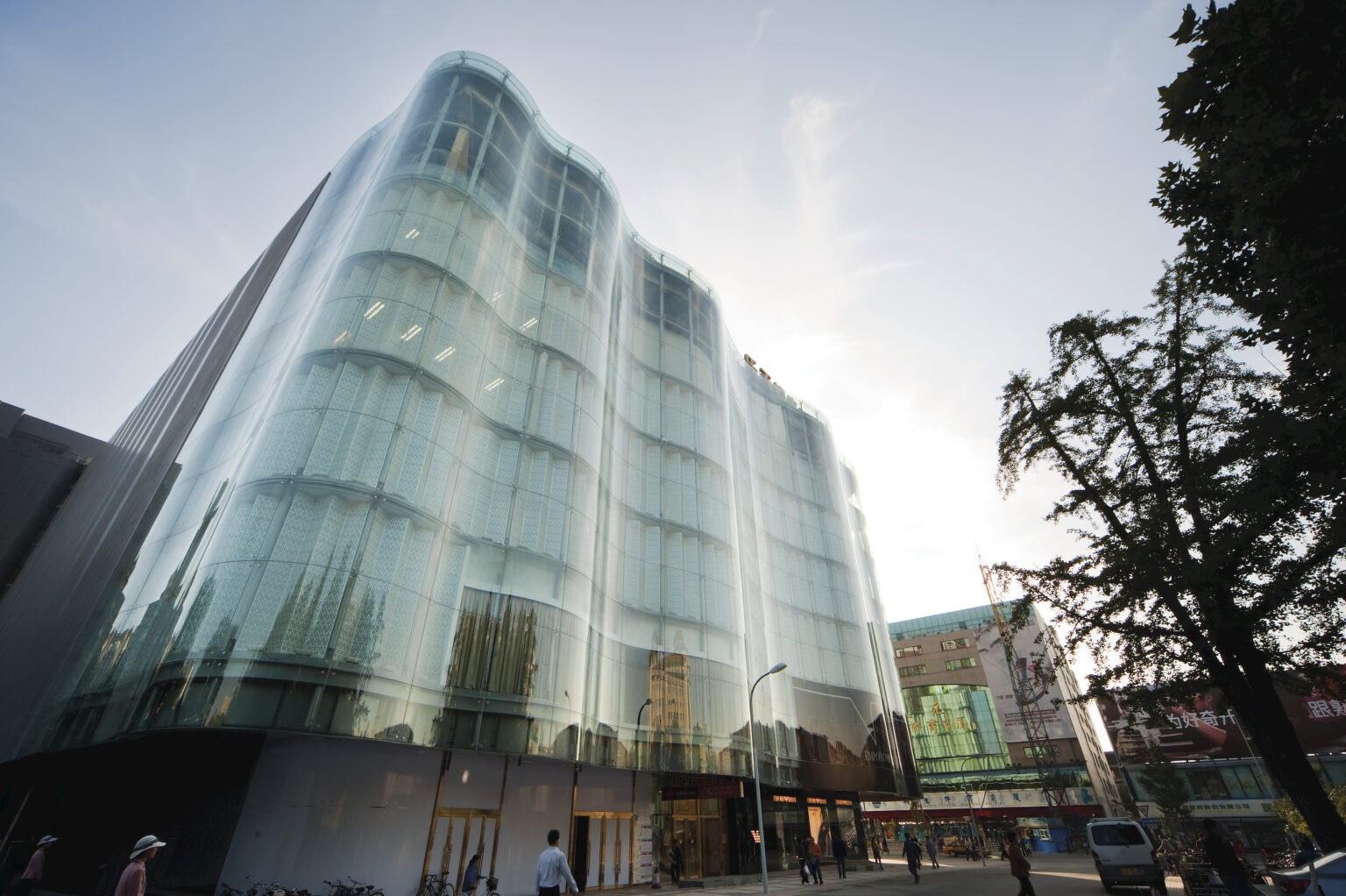 Responding to its historical artistic context and contemporary program of uses, the building is conceived as a theatre behind a transparent glass stage curtain. The glass curtain provides an opportunity to view, in select spots, an interior of colour, movement, advertising and display visible to Wang Fu Jing and Jin Yu Hu Tong Streets.