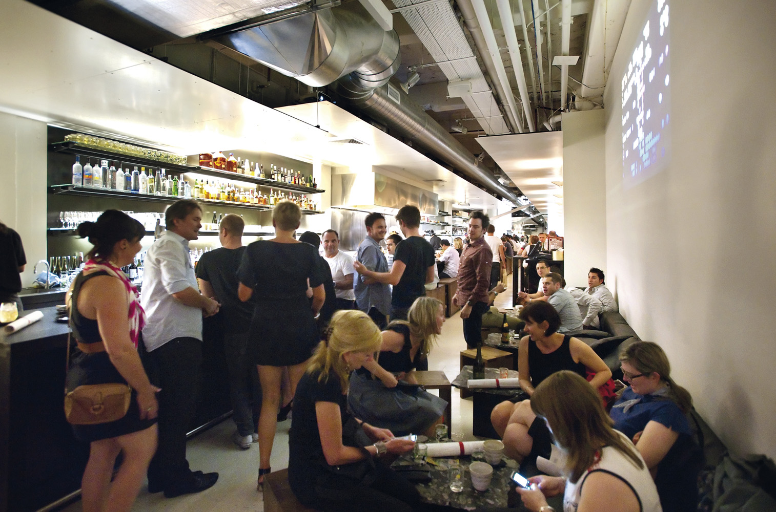 Elevated tables offer a view of the busy preparation/cooking area behind the full-length bar. At the far end is a communal stone table; a large mirror behind it extends the space further and conceals the back-of-house.