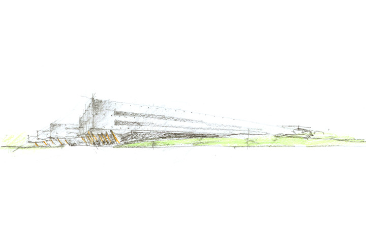 The hospital is divided into three wings, over four levels. Each wing is connected via glazed link bridges to form a unified design. A series of landscaped berms partially conceals the lower floor and reduces the overall scale of the building.