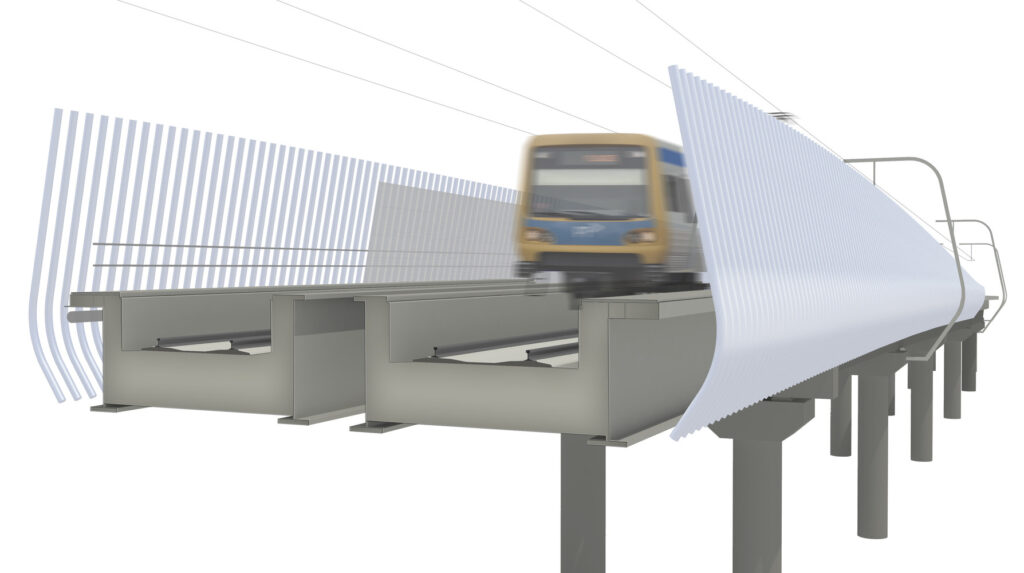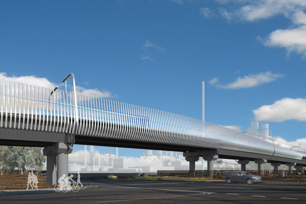 The first in the suite of projects, the Kororoit Creek Road Level Crossing Removal Project (LXRP) references the industrial nature of the site. The cladding is envisaged as a robust series of tubular battens, directly referencing the tubular forms of pipework and chimneys of the nearby Mobil refinery.