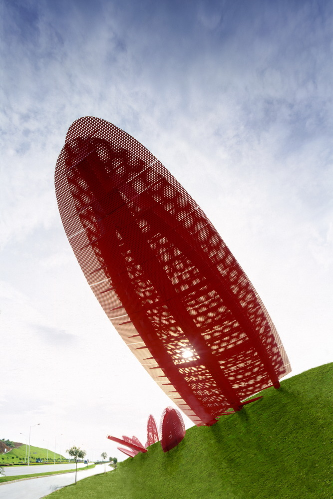 The Nanning Gateway is a strong statement for visitors travelling into the city from the airport. Viewed while pulling away from toll gates, the design presents a pair of monumental sculptural flowers flanking the freeway.