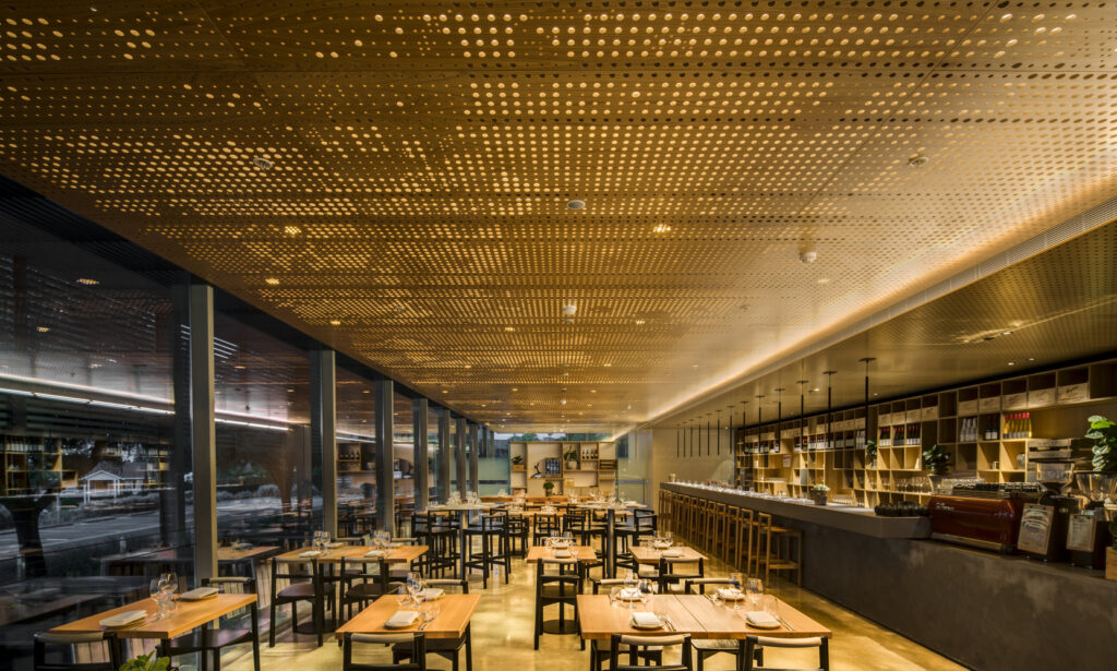Perforated timber ceilings reference the South Australian coastline and Penfolds vineyard locations through the state.  This flows from the Cellar Door to the new café, Magill Estate Kitchen.  The Kitchen uses a combination of lighting through the perforated timber, recreating the feeling of dappled sunlight shining through the vines.  Located in a transparent glass cube, the Kitchen allows visitors to enjoy views of the heritage-listed Grange Cottage and the surrounding vineyard, when dining indoors or on the grand veranda.