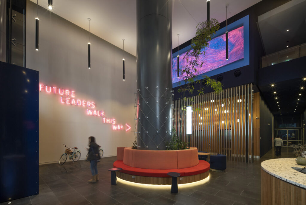 With 812 student apartments and 139 short stay apartments over 41 levels, the building comprises a nine level podium of 10,000m² PCA grade A commercial floor space.
