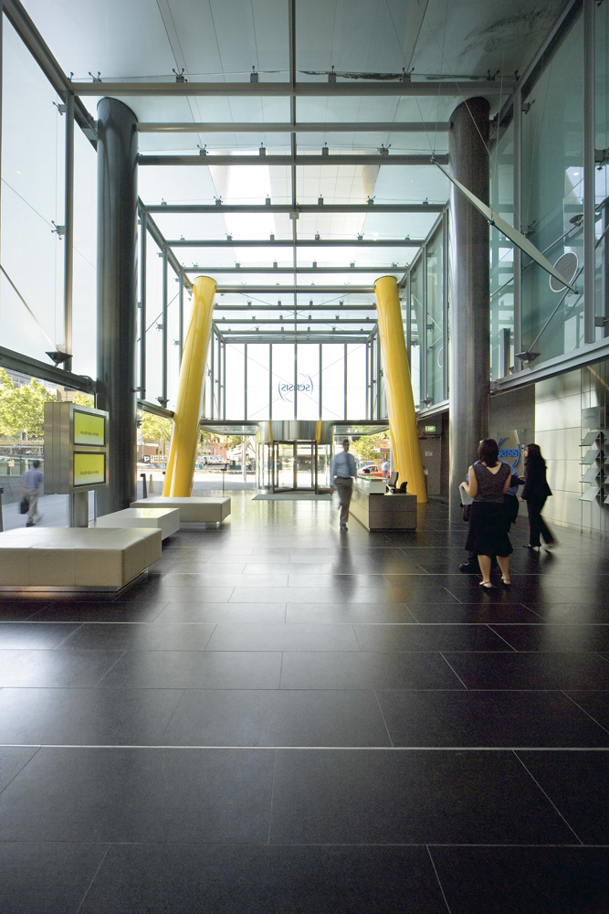 Where the ground level identity and address is needed, the foyer is visually connected to the floors above by distinctive inclined columns supporting a complementary transparent box form.