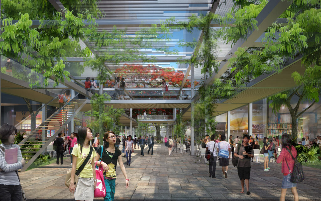 The symbolic and functional hub, the Campus Centre, is composed of pure cubes. It comprises the library, auditorium, International Design Centre and the Forum. The Forum is a large covered outdoor room with skylight roof creating a generous light-filled, green space.