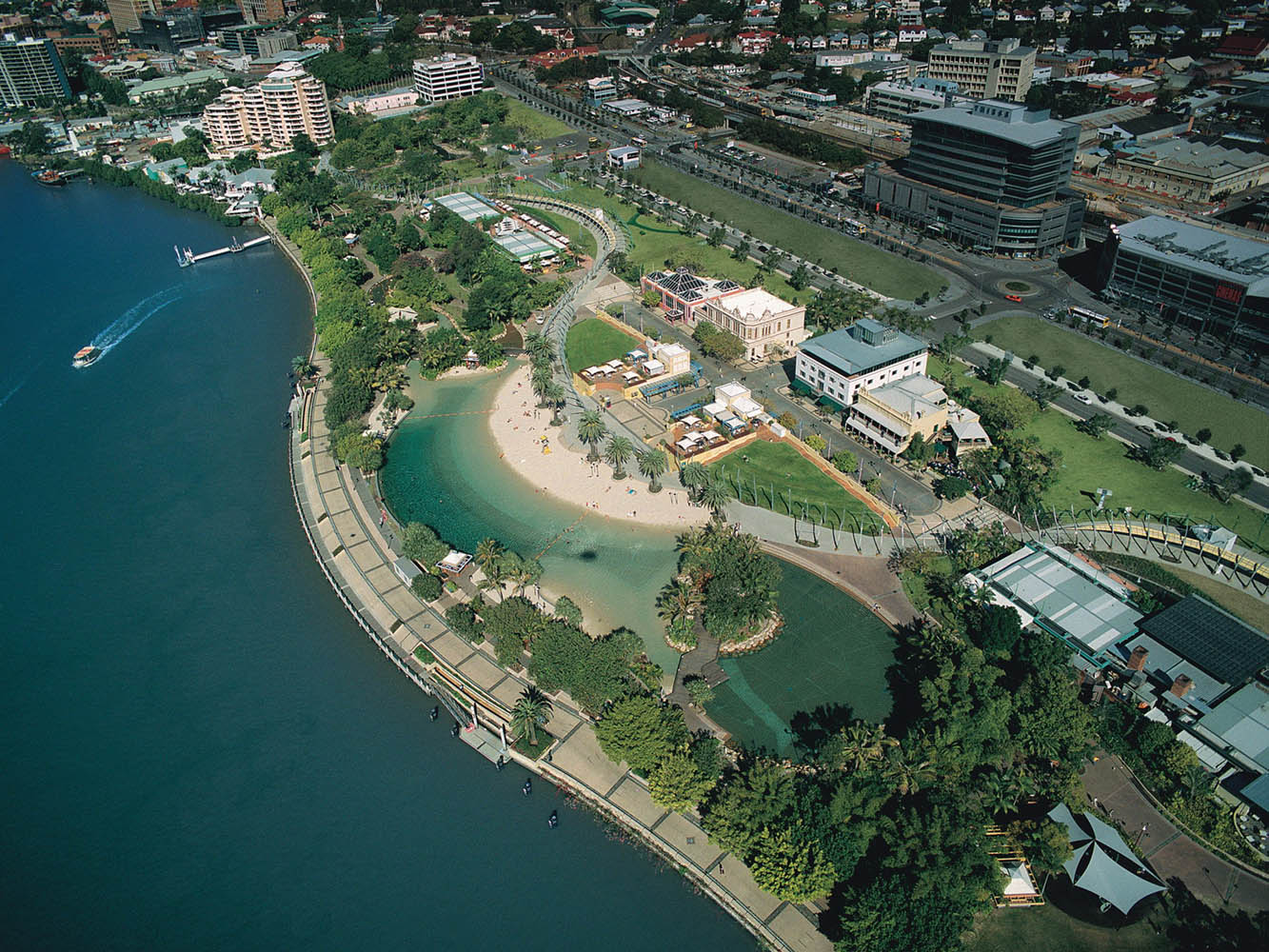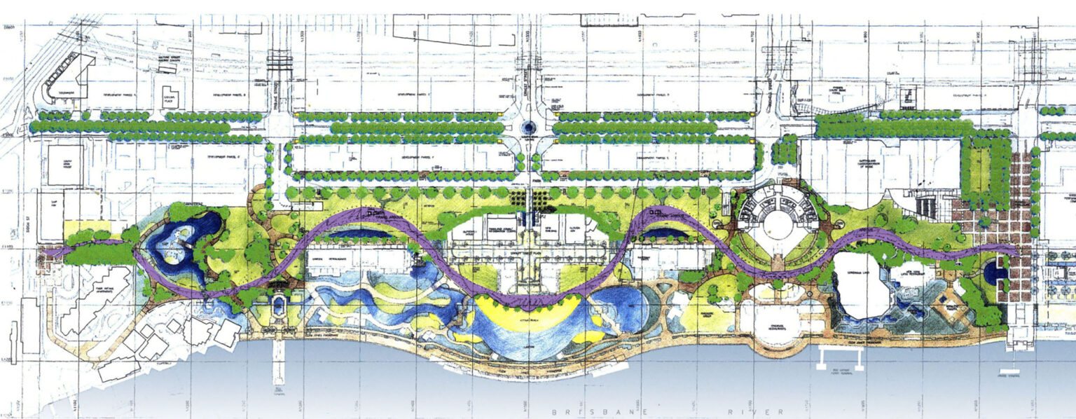 Denton Corker Marshall was commissioned to prepare a new urban masterplan for the former 20 hectare site of Brisbane Expo ’88, located on the south bank of the Brisbane River, looking north towards the city centre.