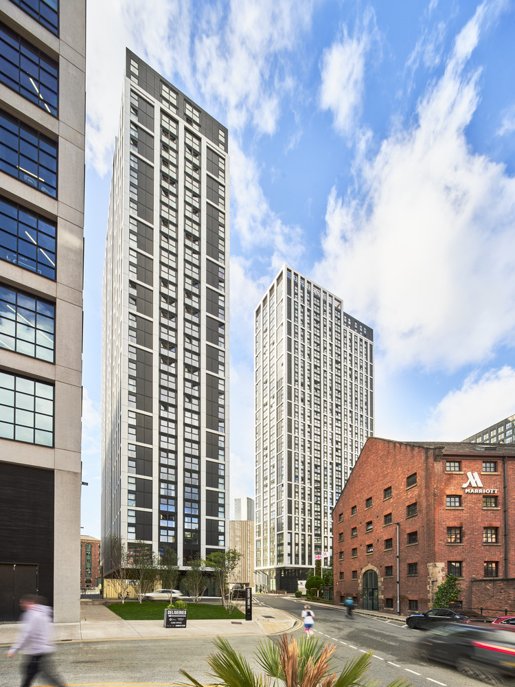 The buildings are at the core of St. John’s Enterprise City, one of Manchester’s primary regeneration areas. They are designed as a pair, united by their materiality but subtly distinguished by their overall architectural composition with an articulated silver-grey ‘grid’ laid over a dark ‘box’. The vertical ‘grid’ spans two and four storeys to emphasise their slender form.