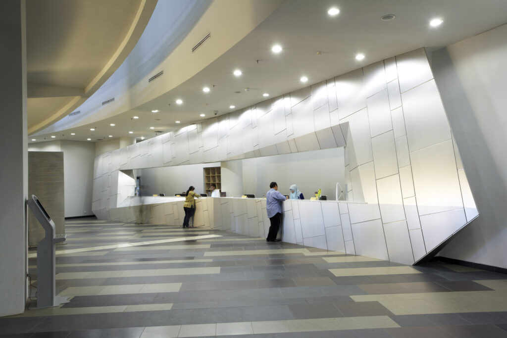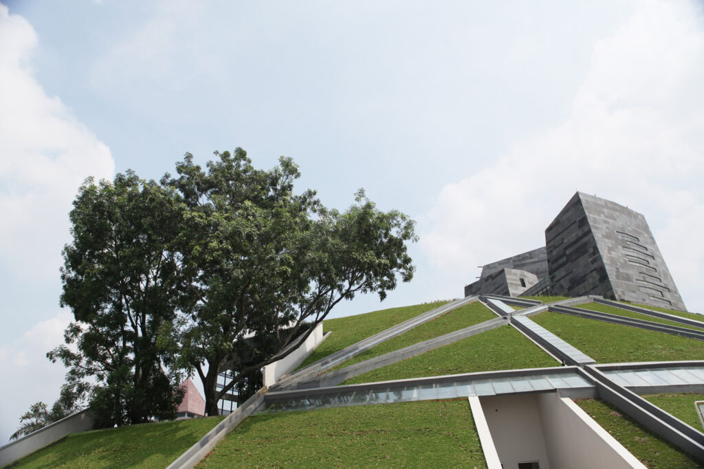 Winner of a National Design Competition, the 28,900m² library is designed as a series of abstracted stone tablets – ‘prasasti’ – rising from a circular grass-covered earth mound.
