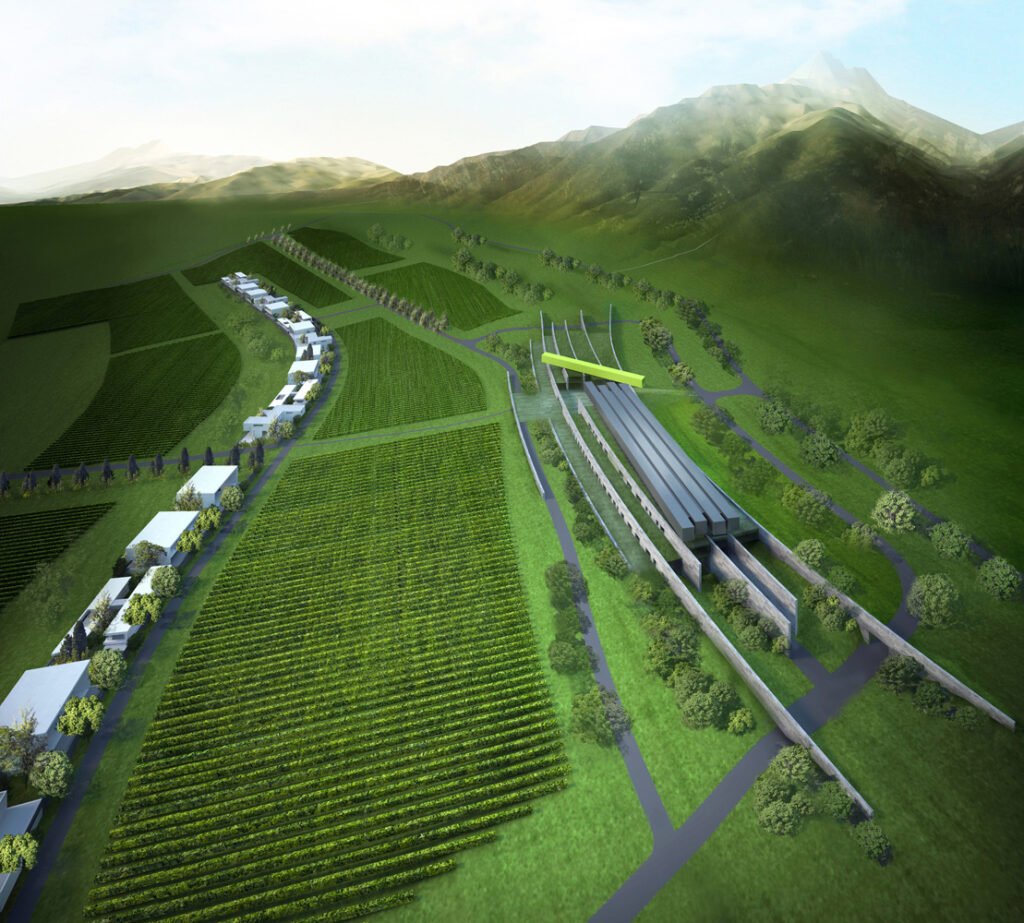 The 100 hectare site sits in rural land sheltered by a mountain range. A gradual approach along an 800 metre avenue heightens the sense of arrival.