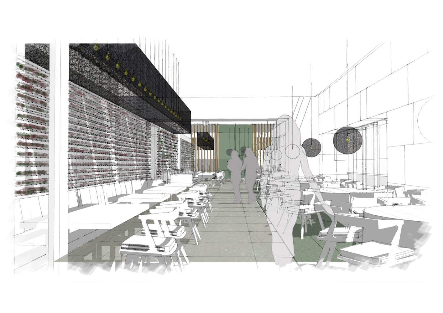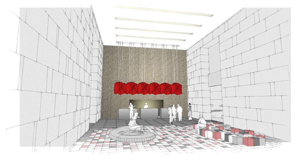 The expressive gesture is of long walls with sticks on top, and a skewed metal tube resting jauntily on the sticks. The buildings are configured to follow the land contours. Submerged into the landscape, they come into view as a succession of stack stone walls.