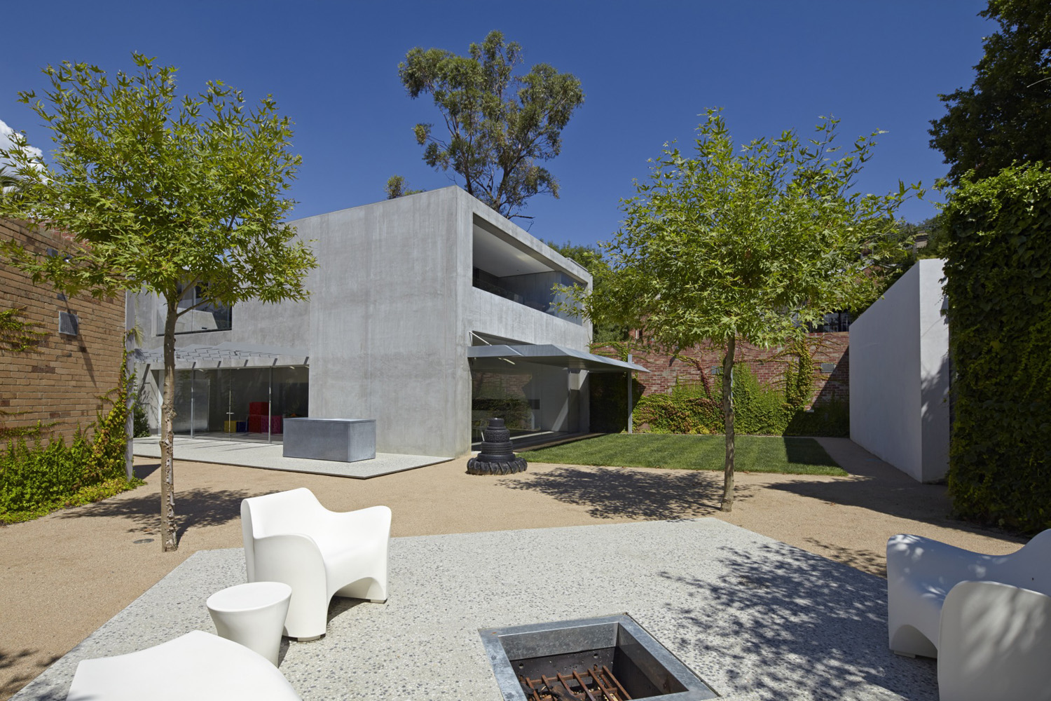 From the front door onwards it is the dextrous use of zinc which permeates throughout, softening the other palette of concrete floors and plaster. A section of thick zinc-clad wall pivots to allow access through an art gallery and living space, to the more private spaces of the house. Art and family living merge and flow throughout.